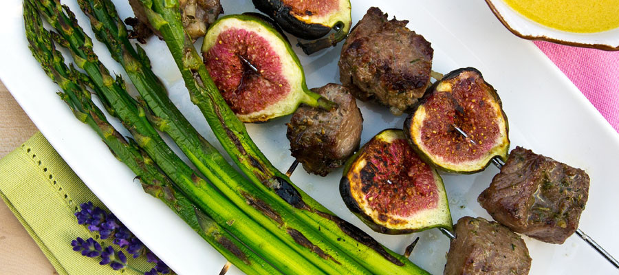 Mix the pieces of pork with olive oil, thyme, salt and pepper. Pass the pieces of pork on the sticks as follows: one piece of pork, then one half piece of fig, and repeat until the sticks are full. Grill on the barbecue and enjoy with some delicious seared asparagus on the side!