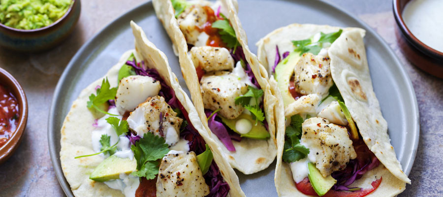Next, heat the olive oil in a large non-stick frying pan over medium heat and cook the fish, about 4 minutes on each side. Then, cut your fish into small pieces and add some salt to taste. Place the fish into the tortilla wraps, add some of your salsa and finish off with the avocado slices. Garnish with some parsley and red cabbage for an extra twist!